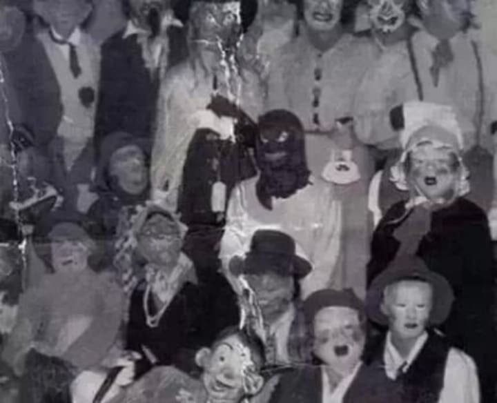 На самом деле, фото — всего лишь старинная хэллоуинская карточка. В те времена люди делали наряды сами — из мешков, простыней, старых чулок. Они выглядели пугающе, но такая уж была эстетика тех лет.