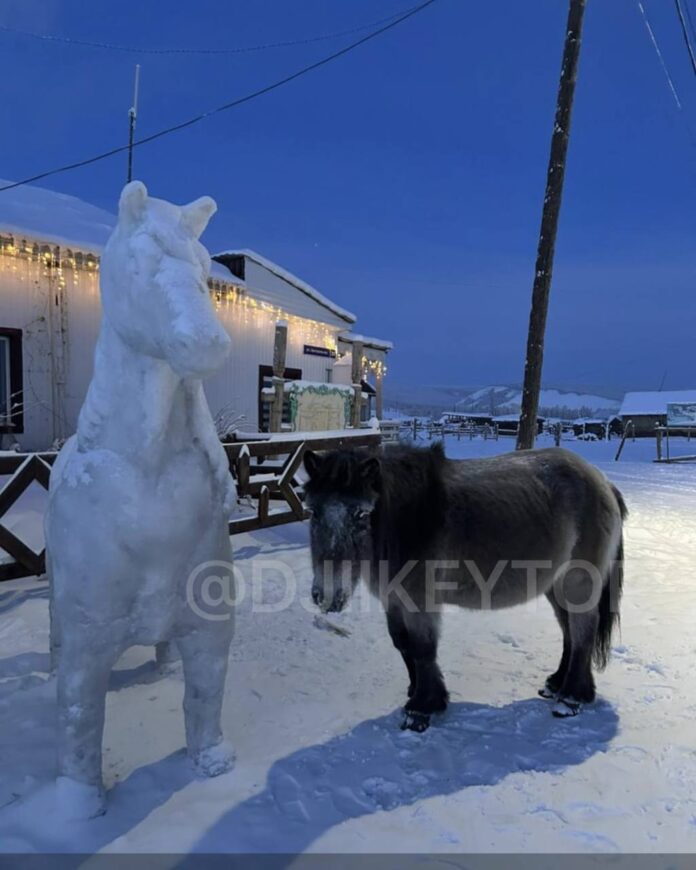 В селе Сартан Верхоянского района возле местного клуба слепили символ будущего года. Теперь к фигуре лошади привязалась кобыла: она часто приходит туда ночевать.